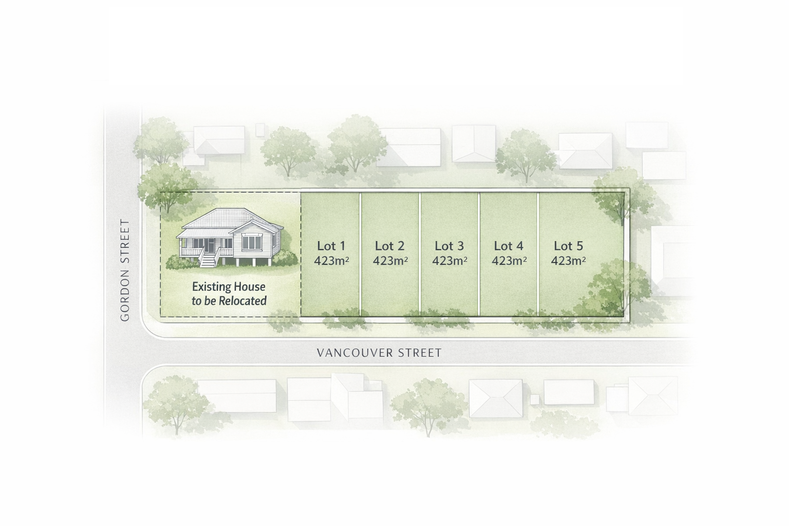 Navigating the site’s bushfire, vegetation and flooding constraints, Hickey Oatley worked collaboratively with the client and project team to secure approval to subdivide the site. The outcome facilitated the relocation and retention of the existing Queenslander onto a 2,355m² lot adjoining a vegetated reserve whilst also creating 4 x 420m² vacant lots.